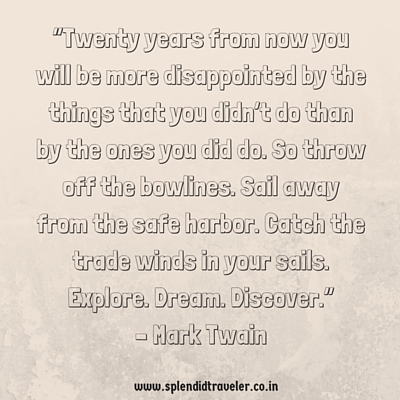 “Twenty years from now you will be more disappointed by the things that you didn’t do than by the ones you did do. So throw off the bowlines. Sail away from the safe harbor. Catch the trade winds in your sails. Explore. Dream. Discover.” – Mark Twain