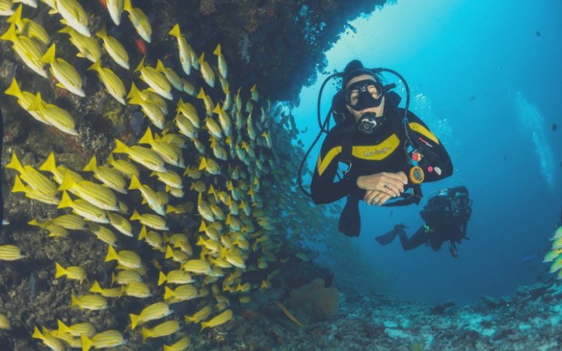 Scuba Diving is an exhilarating underwater experience that you can try out. Get to see the colors you may not have seen before going underwater ever. The variety of patterns on the fishes, the various shapes sizes and colors of coral and everything looks so bright and colorful inside.